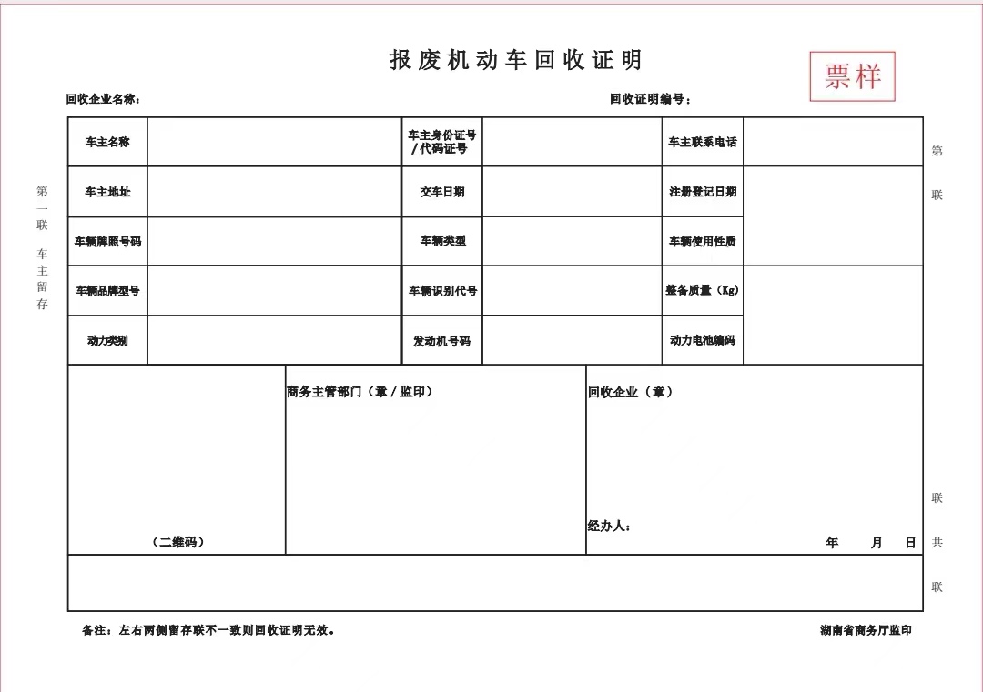 (四)出具《報(bào)廢機(jī)動(dòng)車回收證明》的企業(yè)必須是有資質(zhì)的報(bào)廢機(jī)動(dòng)車回收拆解企業(yè);開(kāi)具《機(jī)動(dòng)車銷售統(tǒng)一發(fā)票》的企業(yè)登記注冊(cè)地必須在湖南省。
